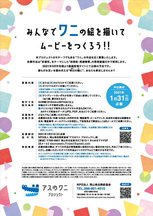 NPO法人 岡山県自閉症協会から「アスのワニプロジェクト」イラスト募集のご案内が届きましたのでお知らせいたします。コロナ禍、ご家庭でお子さんと一緒に参加できる活動です。