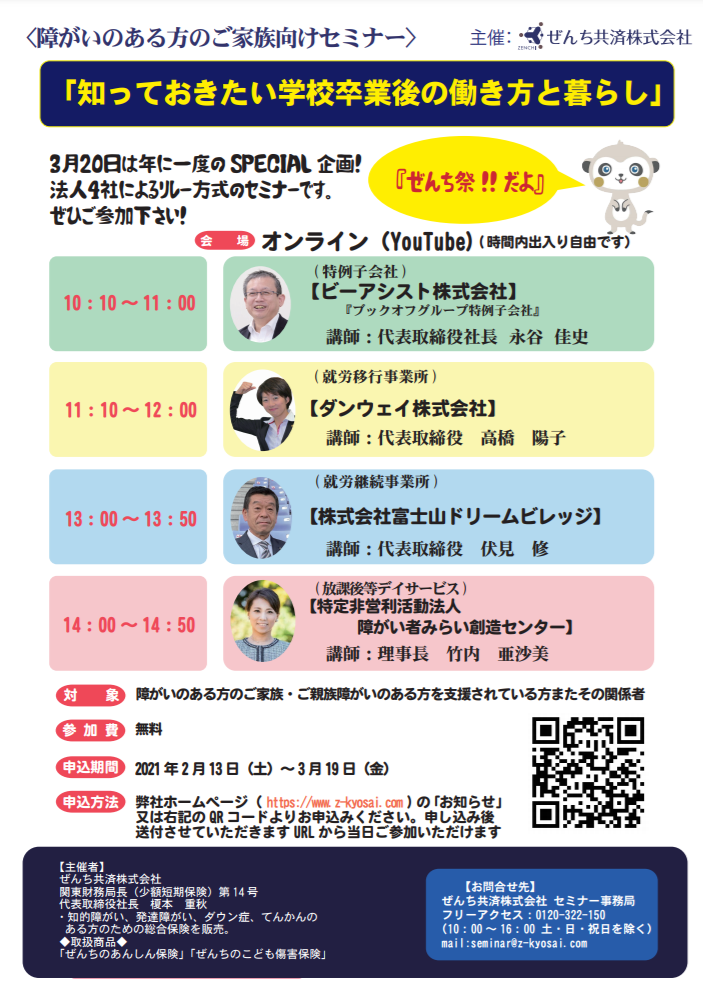 【ぜんち共済】障がいのある方のご家族向けセミナー「知っておきたい!学校卒業後の働き方と暮らし」無料オンラインセミナーのご案内|2021年3月20日
